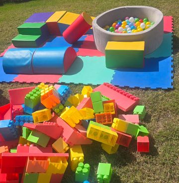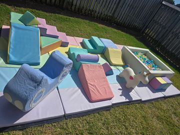 Ballpit, Tunnel softplay set, Grey Slide softplay set, softplay building blocks x 8, stepping softplay, ride on x2, Bee ride on x1, Arch Softplay, Softplay x 8, Large Blocks, Slide, Block play box &mats